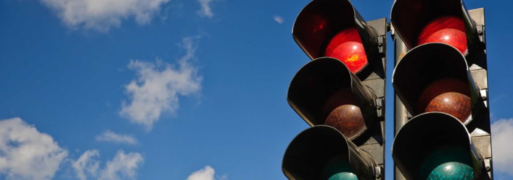 Foto (bearbeitet): "A couple of red traffic lights against a blue sky" von Horia Varlan/ cc-Lizenz by 2.0: flickr